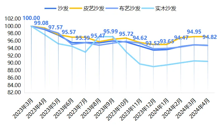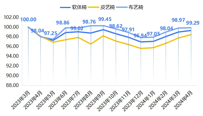 软体床、沙发、软体椅也均呈下跌趋向,具体如下图所示: