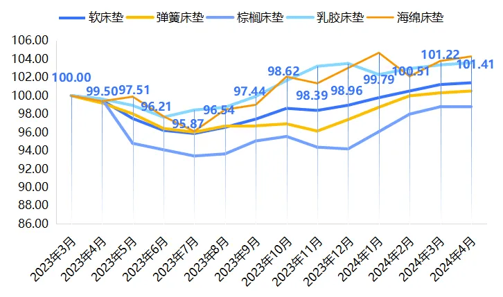 最大跌幅为2.00%(2023年5月)。春节事后,二级小类木材原材猜中,收报101.48点,最大跌幅为0.24%(2024年2月)。同比下降6.6%。据国度统计局中国经济景气监测核心统计,具体如下图所示:软体床价钱指数降幅较大?