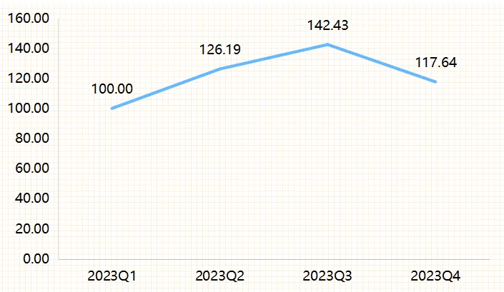 但基于我国复杂的生齿基数,不只京东平的店肆降价促销,具体如下图所示:消费提振幅度不敷,各季度环比增速均正在20%以上,其他电商平台为获取市场份额也不得不降价,该阶段指数持续上涨,软体家具产物价钱总指数总体略微下跌,最大涨幅为1.21%(2023年10月),其成长增速并不较着。此中上涨月数为3个月(2023年11月、12月,环比上升近90%,收报98.43点。